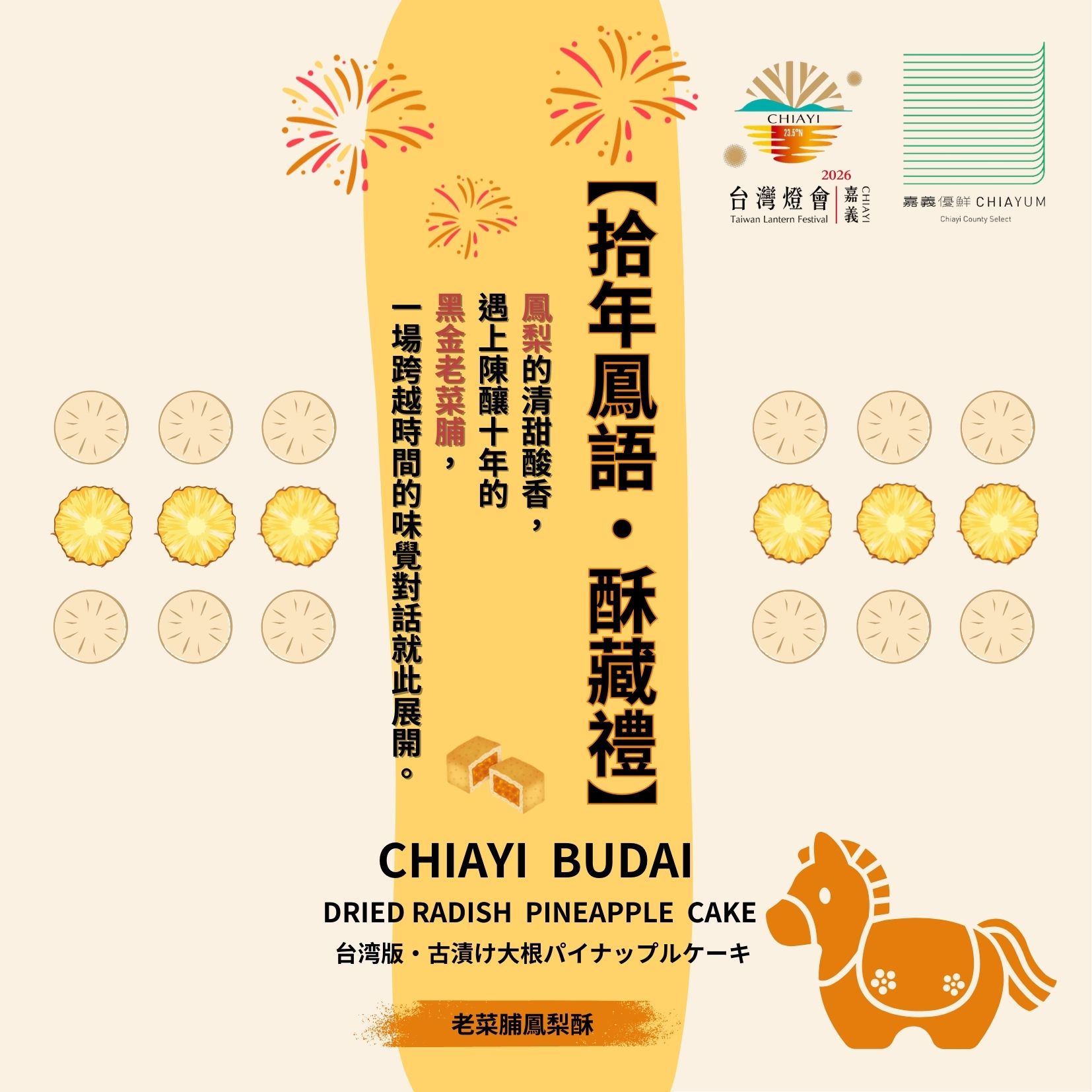 這款糕點選用嘉義布袋在地日曬老菜脯,經歲月熟成後散發獨特醇香,與土鳳梨餡融合後,在酥皮中展現鹹甜交織、層次豐富的風味。每一口,都是對傳統智慧的致敬,也是將地方食材重新演繹的創新之作。歲月的深度,藏進酥中,讓你品味的不只是美味,更是一段拾年故事的延續。